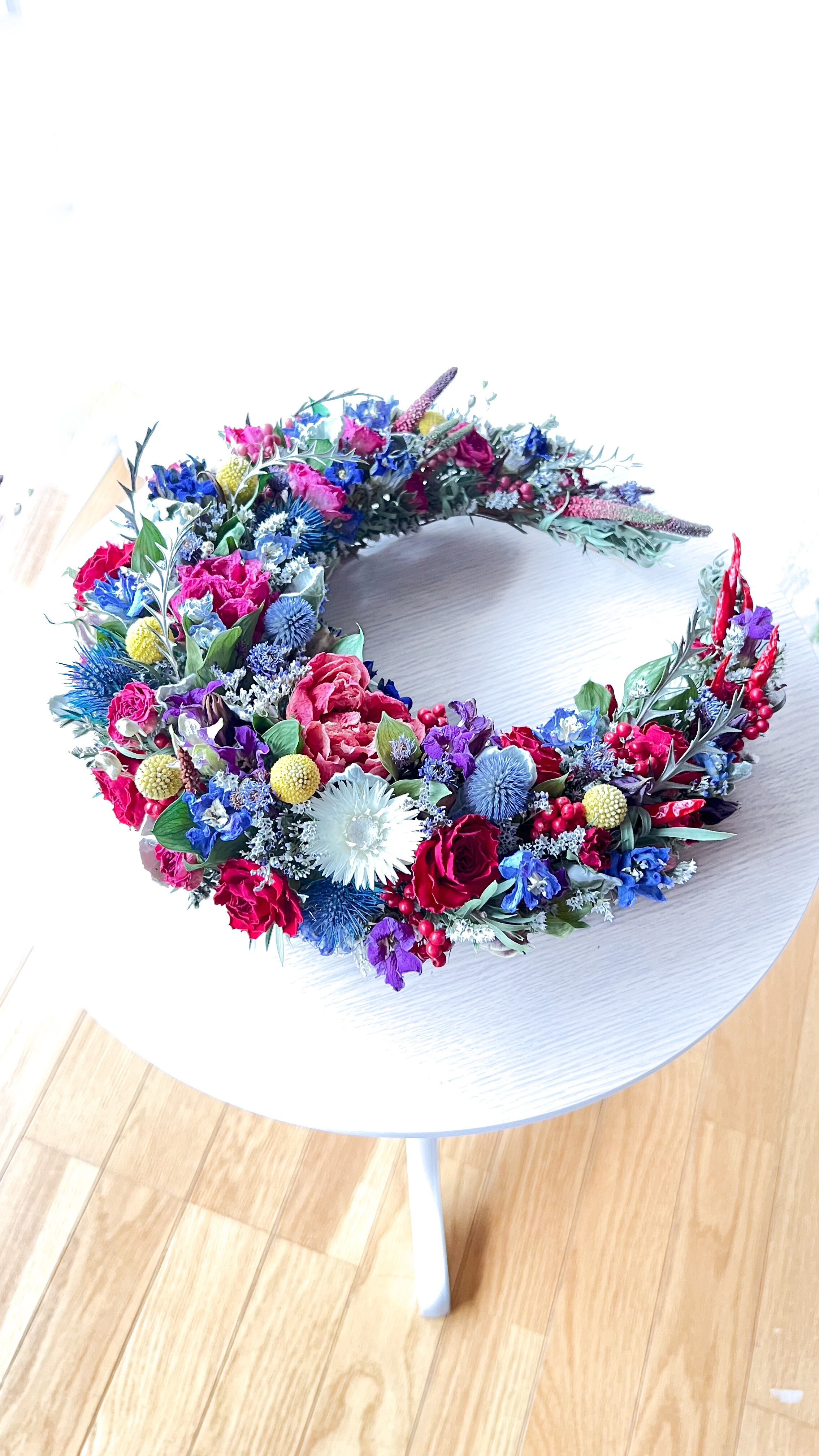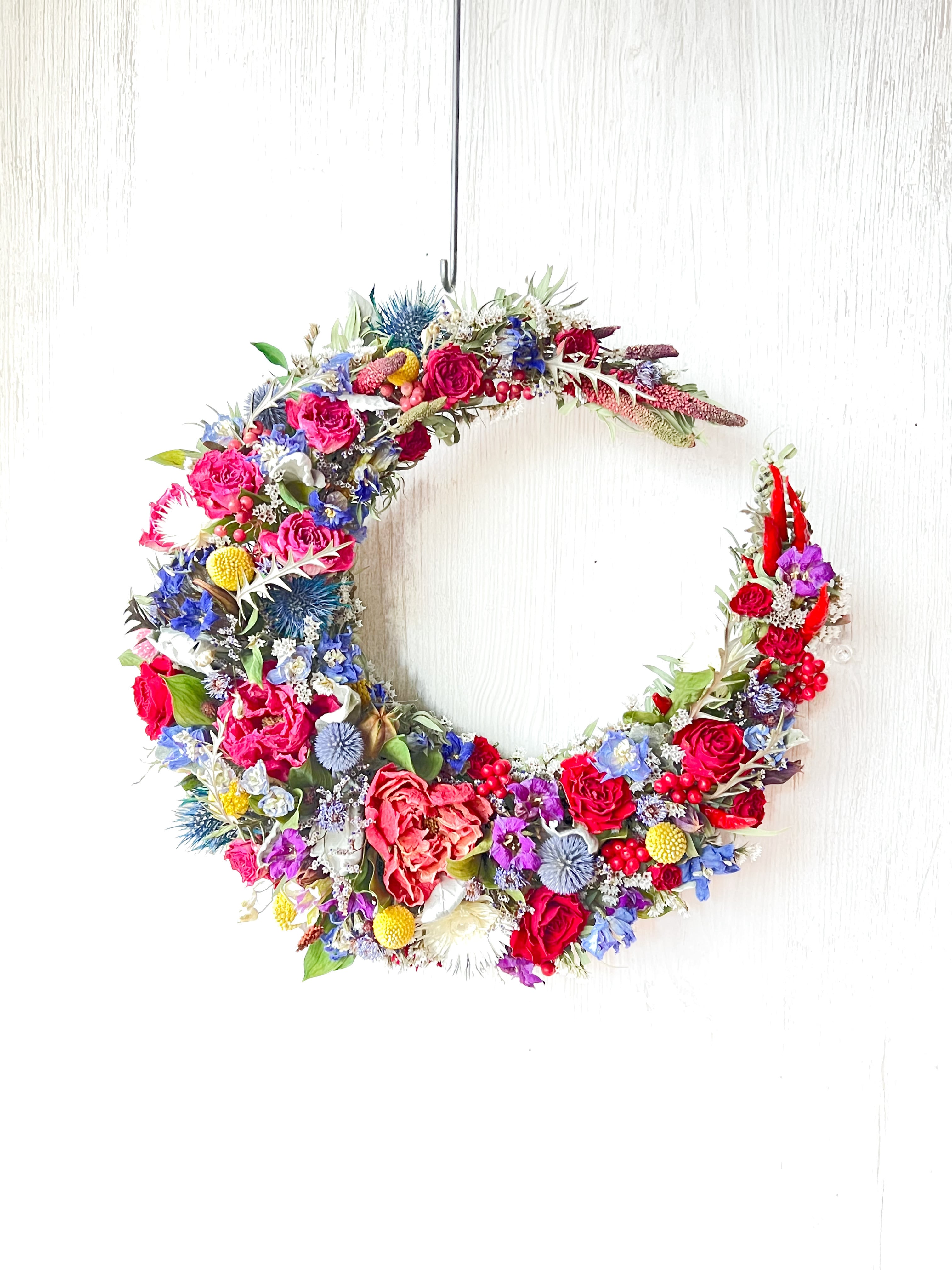 三日月ドライフラワーリース 30cm|カラフルフラワー(シャクヤク×ローズ使用)