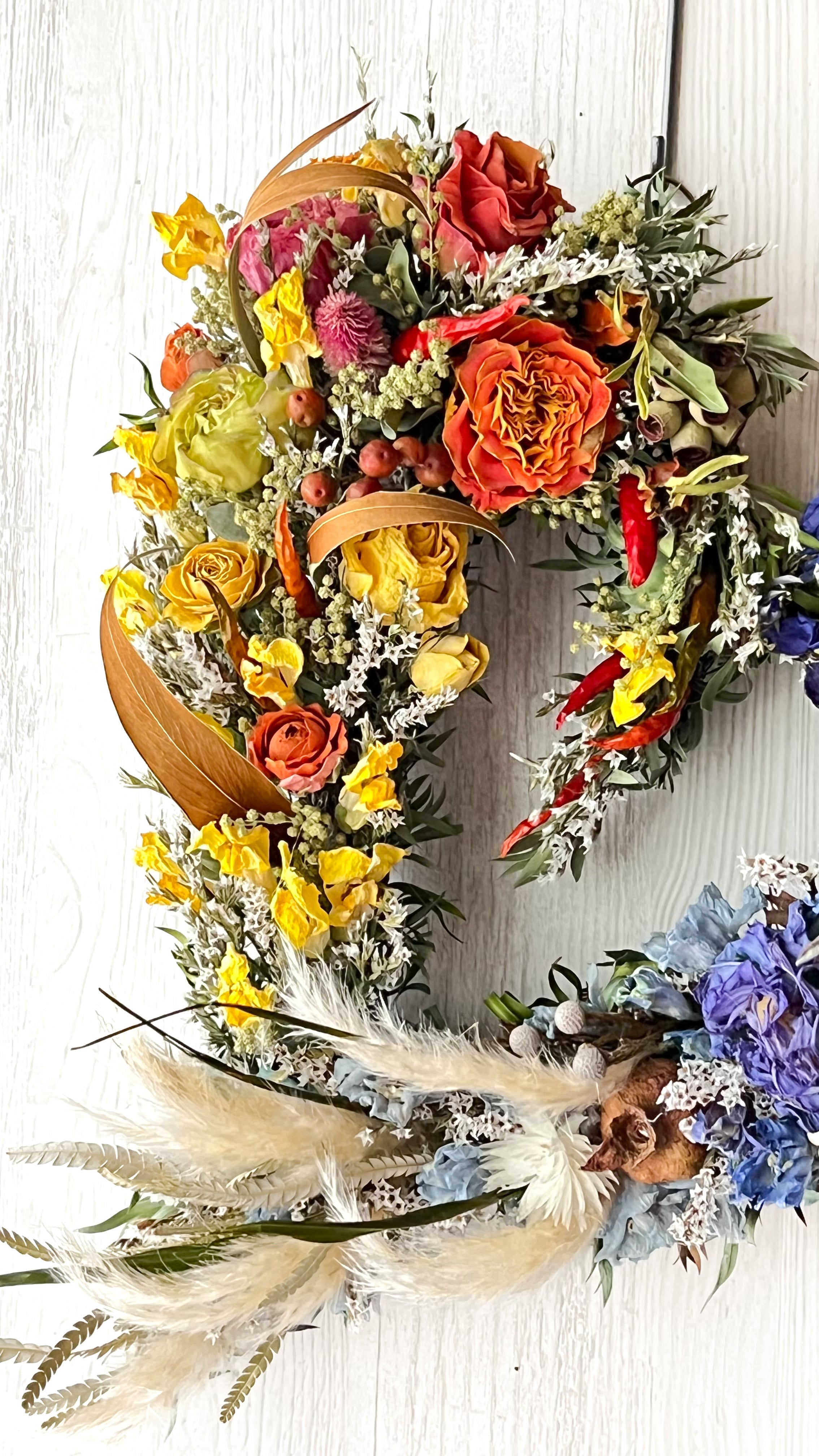 カラフルなドライフラワーのハートリースイエローとブルーのお花のハート