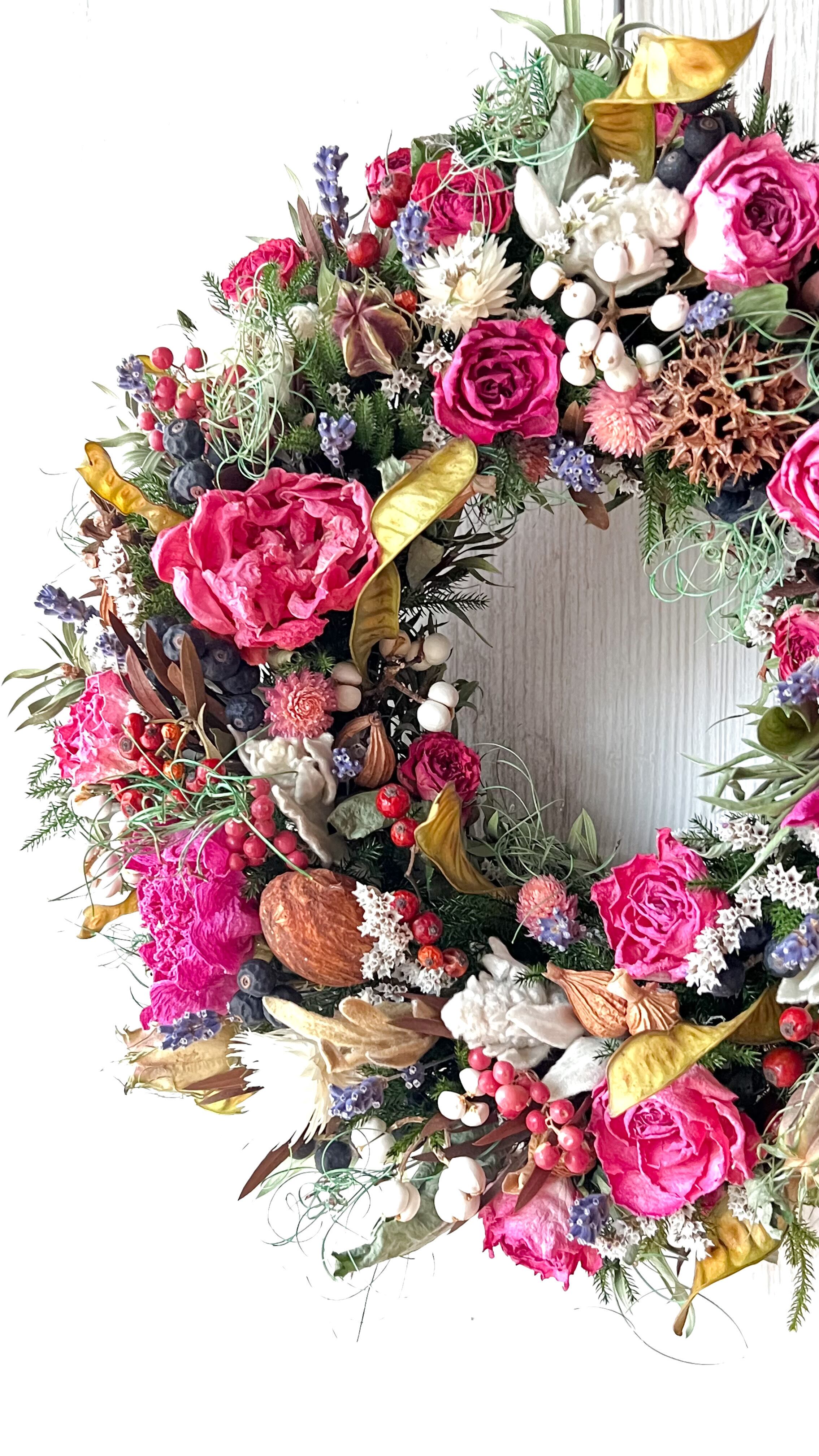 ピンクが可愛い ドライフラワーリース ピンクのシャクヤクとローズ画面華やか