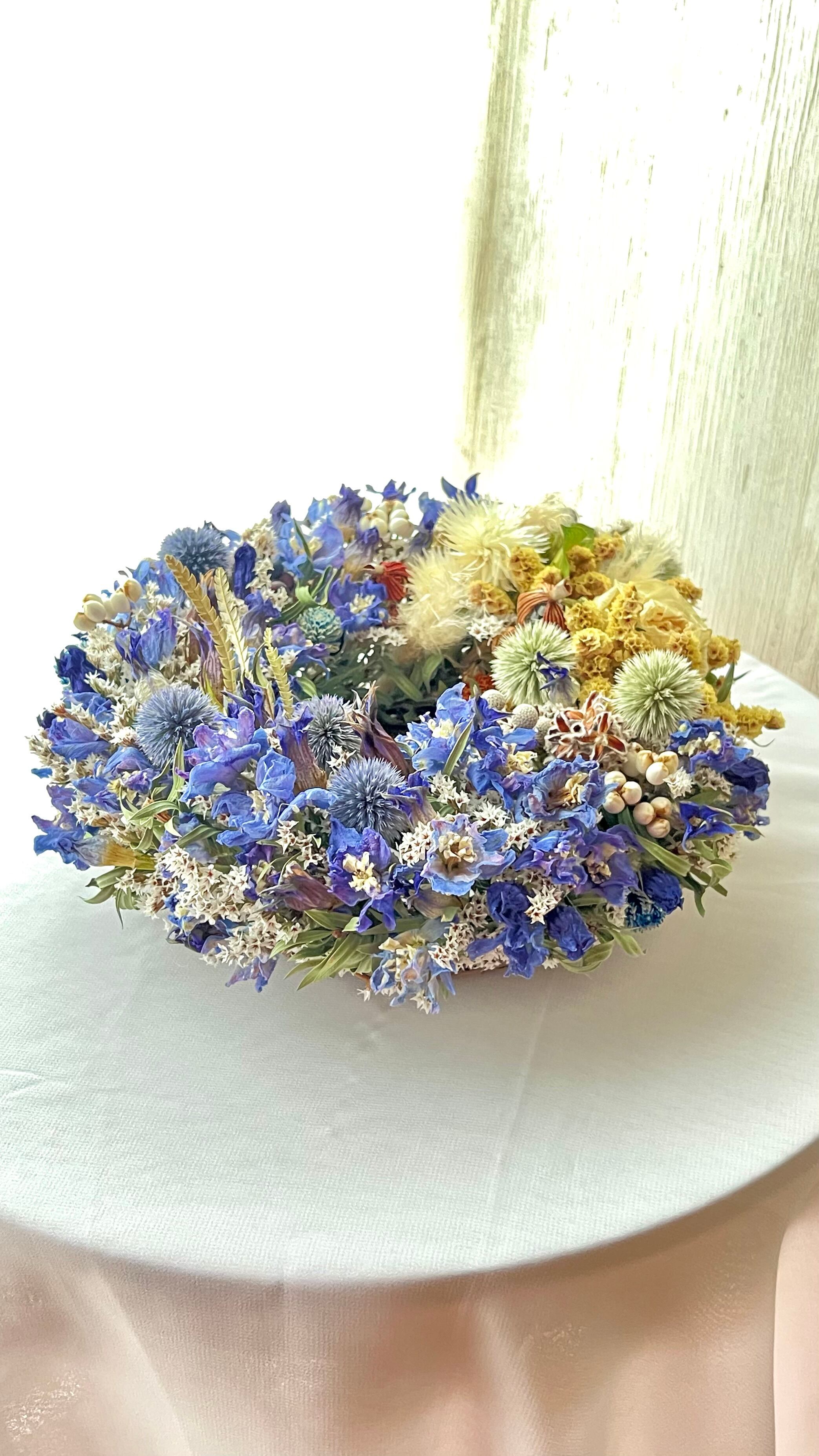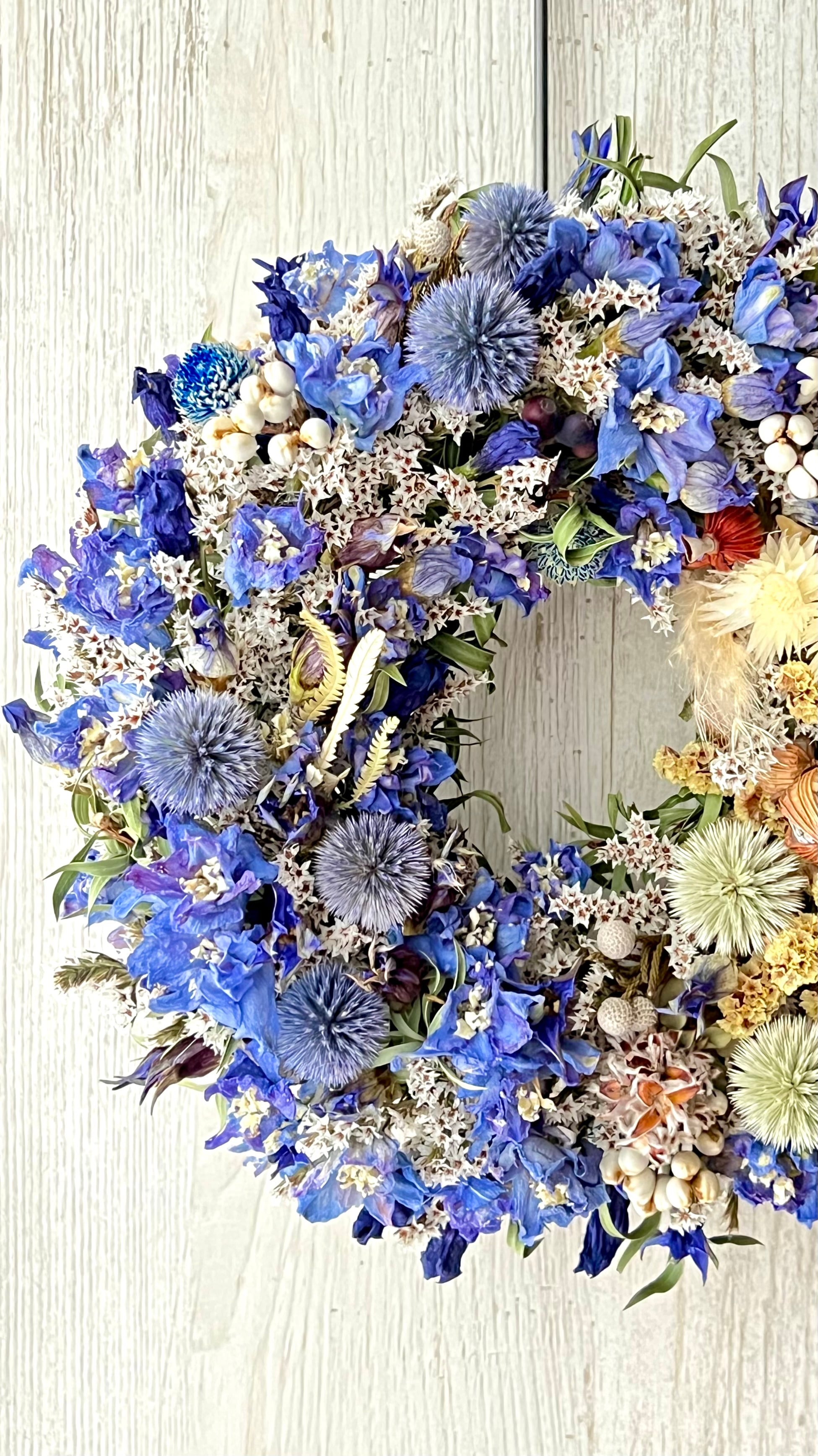 ブルーのドライフラワーリース 蒼色のデルフィニュームとルリタマアザミののリース