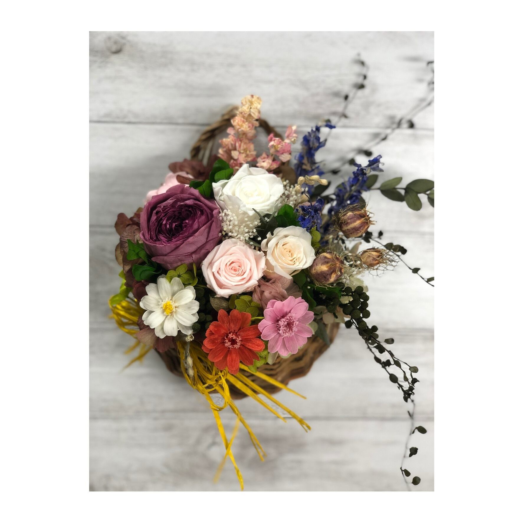 プリザーブドフラワーのローズとジニアを、丸いバスケットにこんもりとアレンジしました。