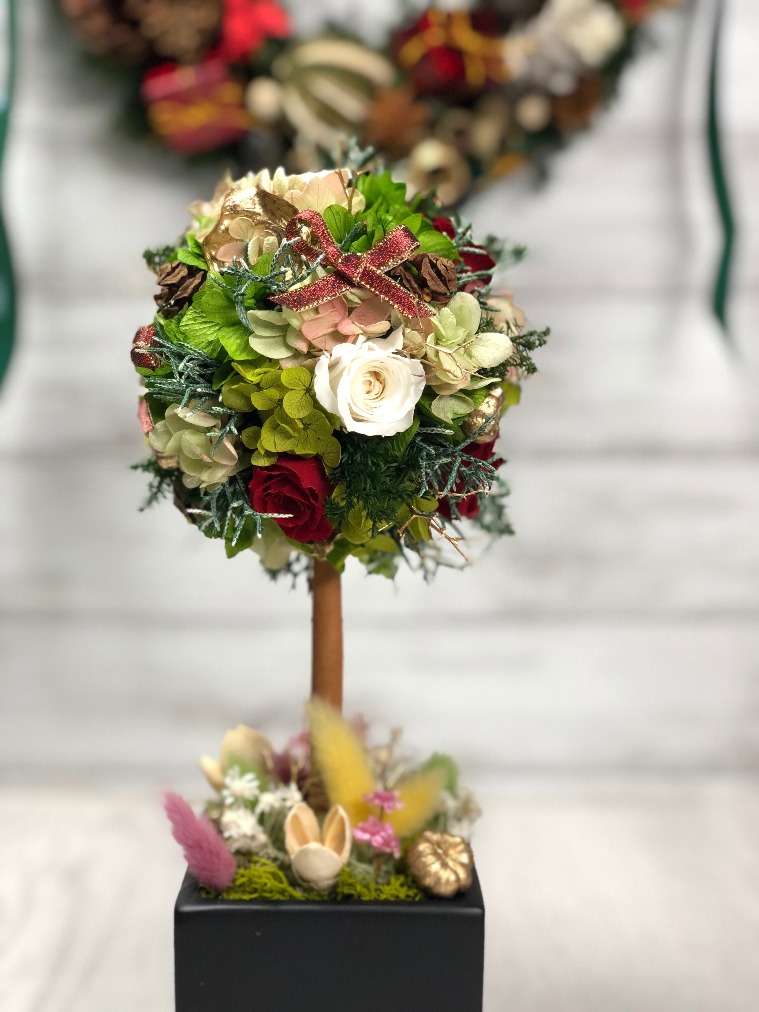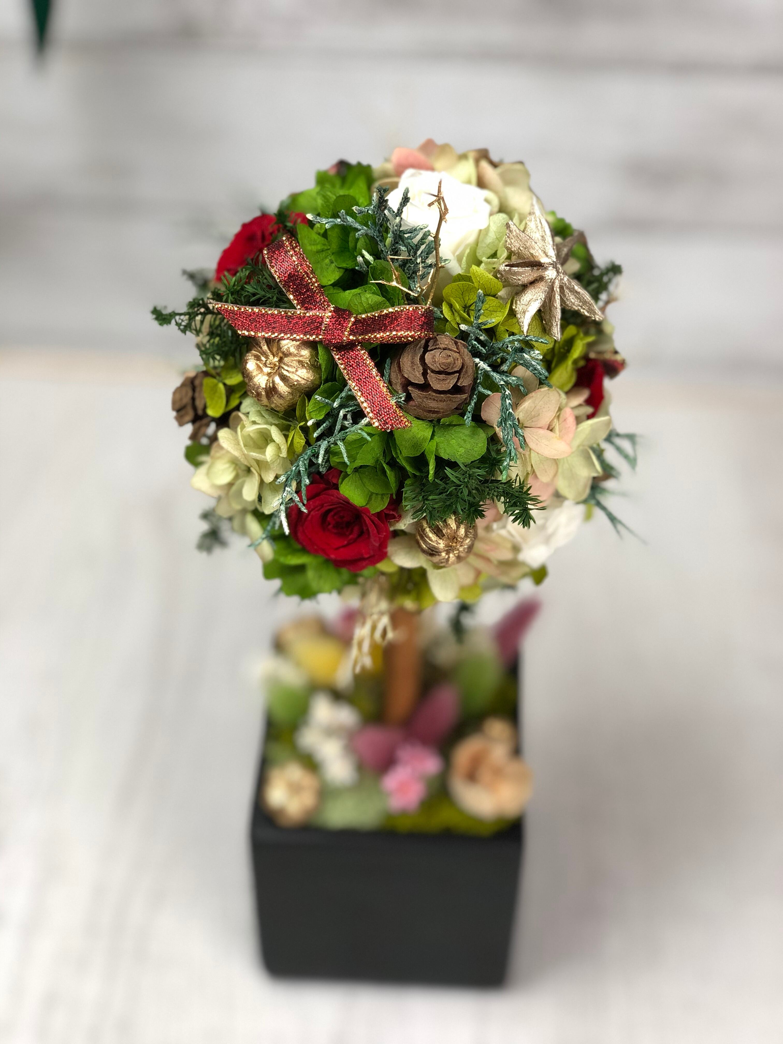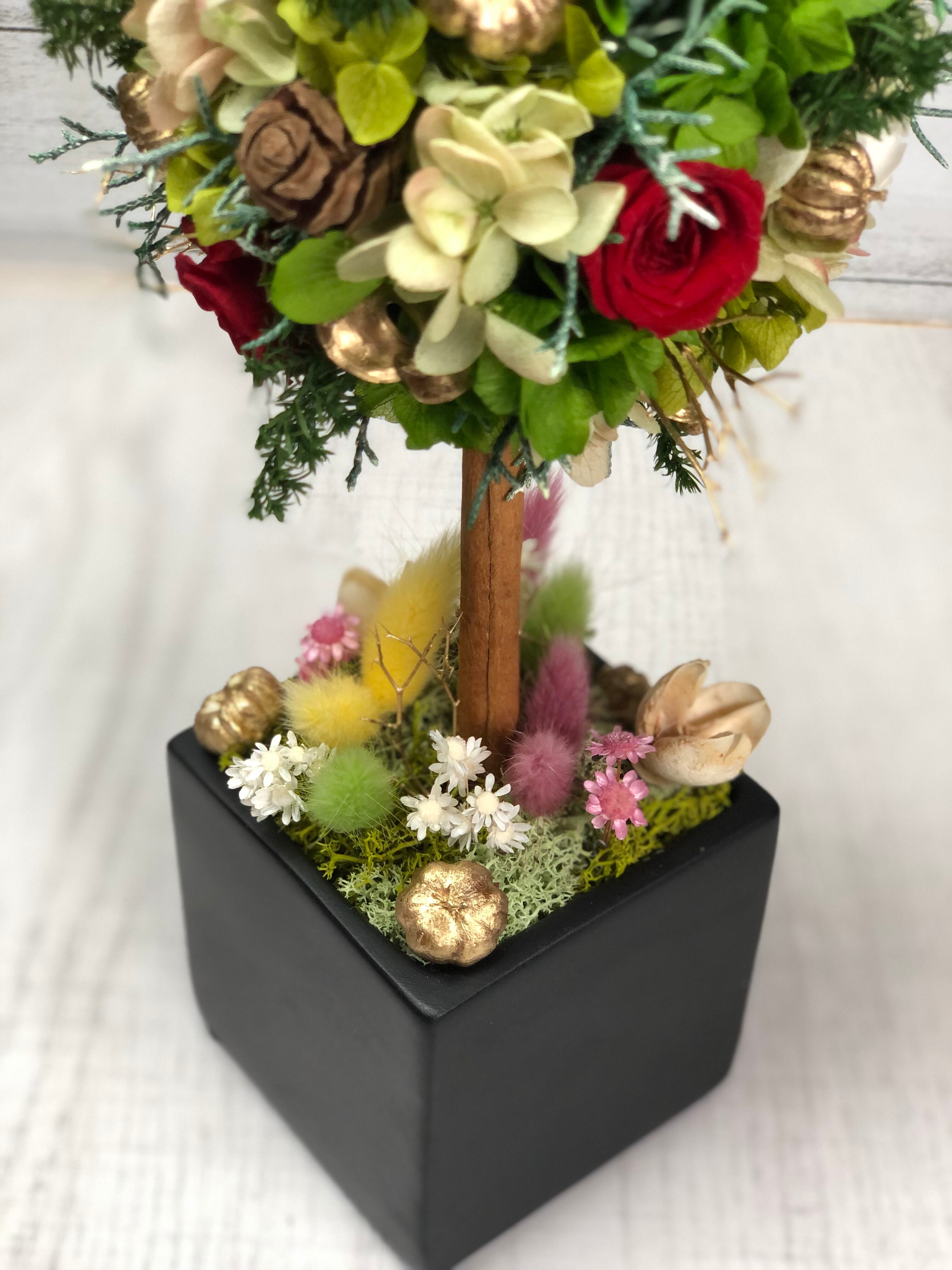 プリザーブドフラワーと木の実を使用した、トピアリーです。