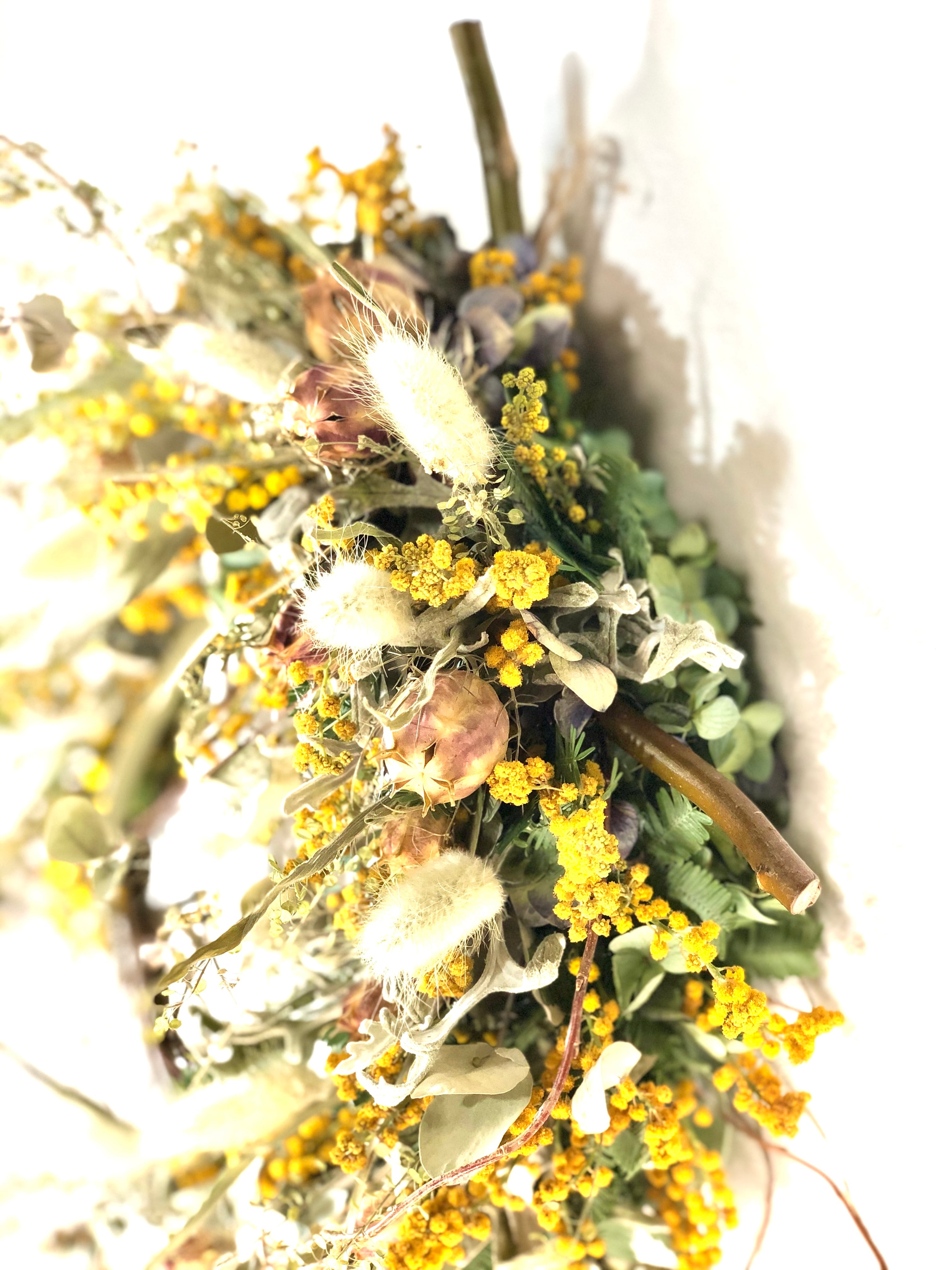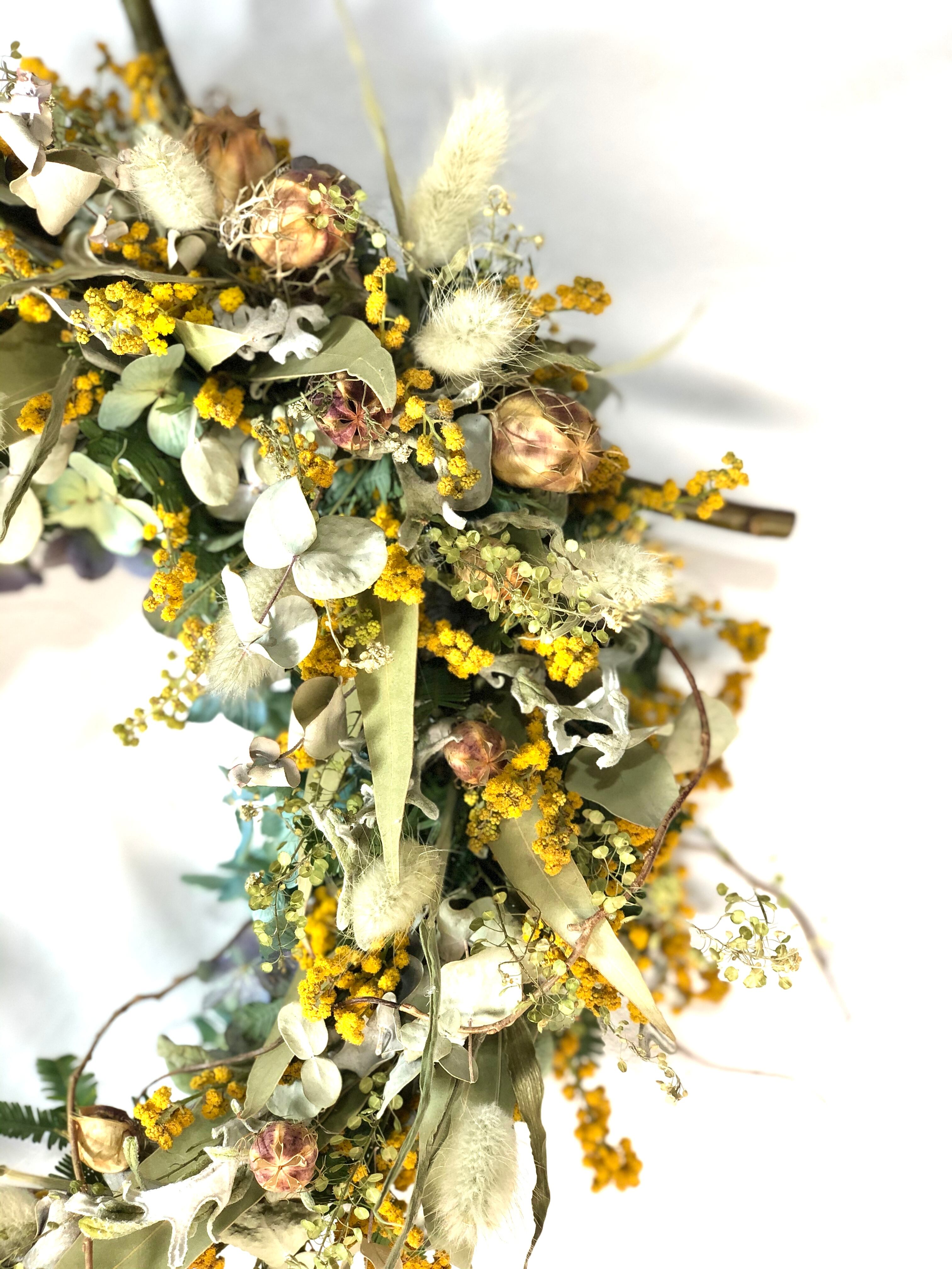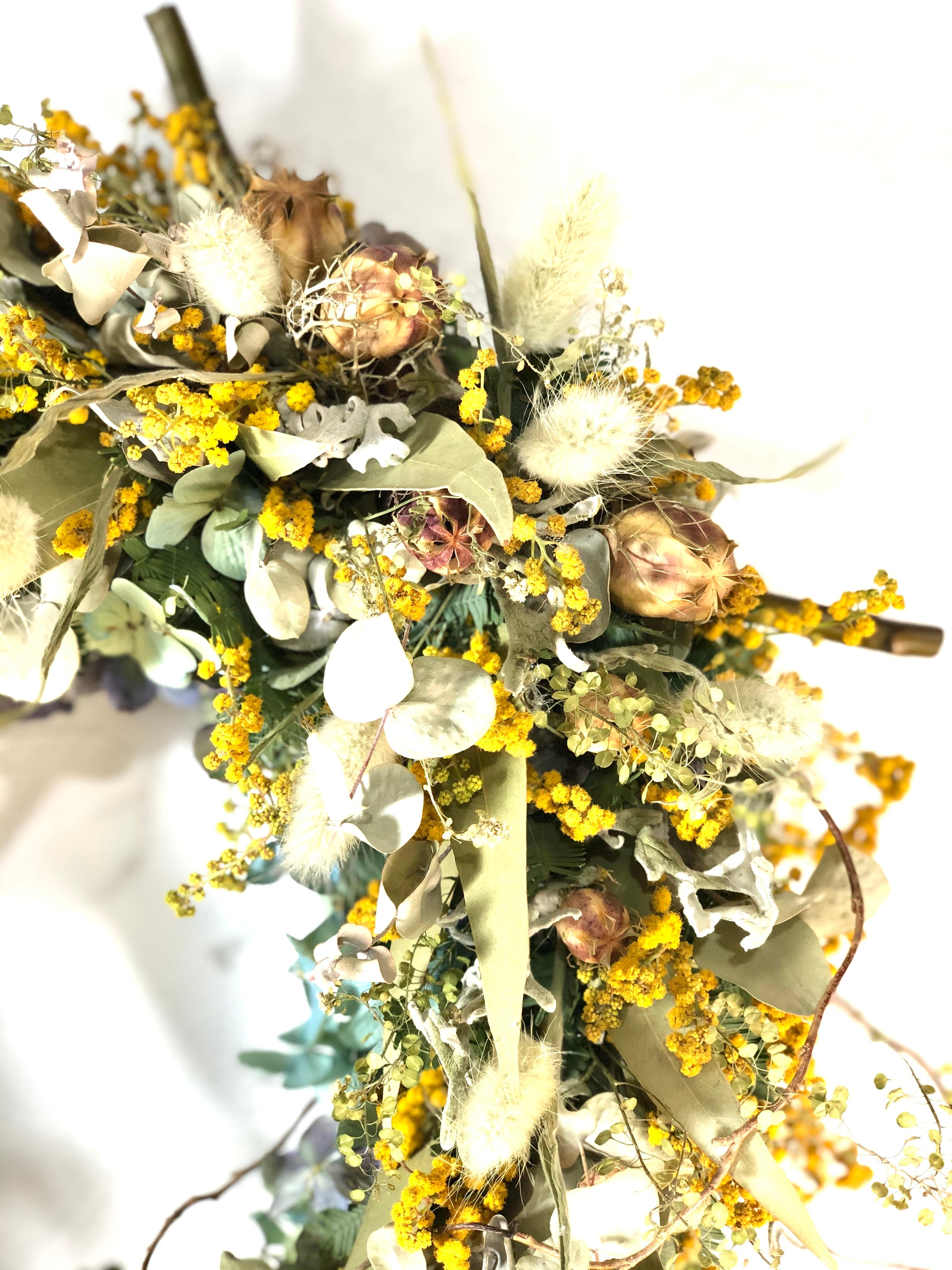 柳の枝を丸めて、銀葉ミモザとユーカリ