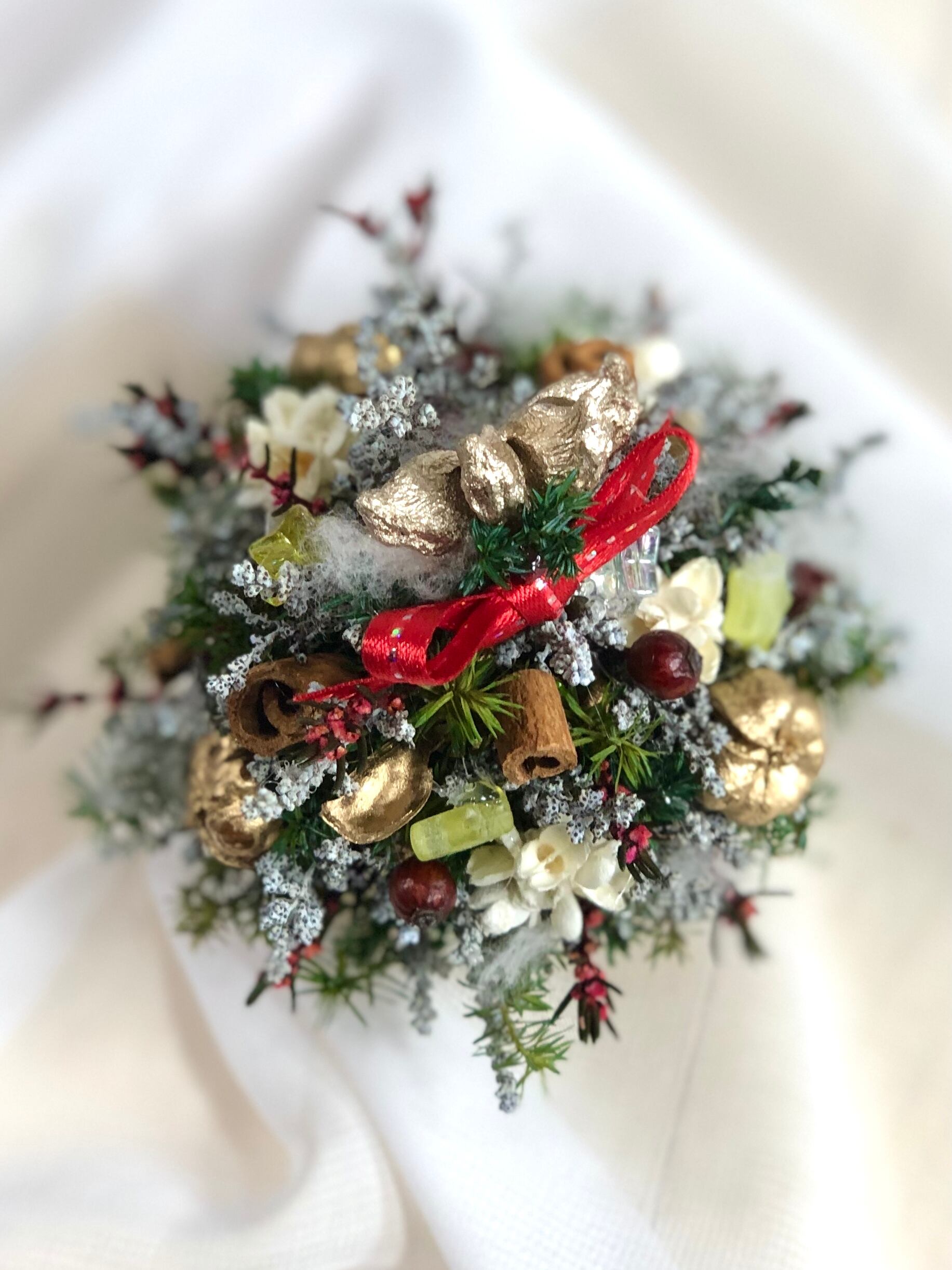 木の実などの飾りを付けて、ドライにしました。