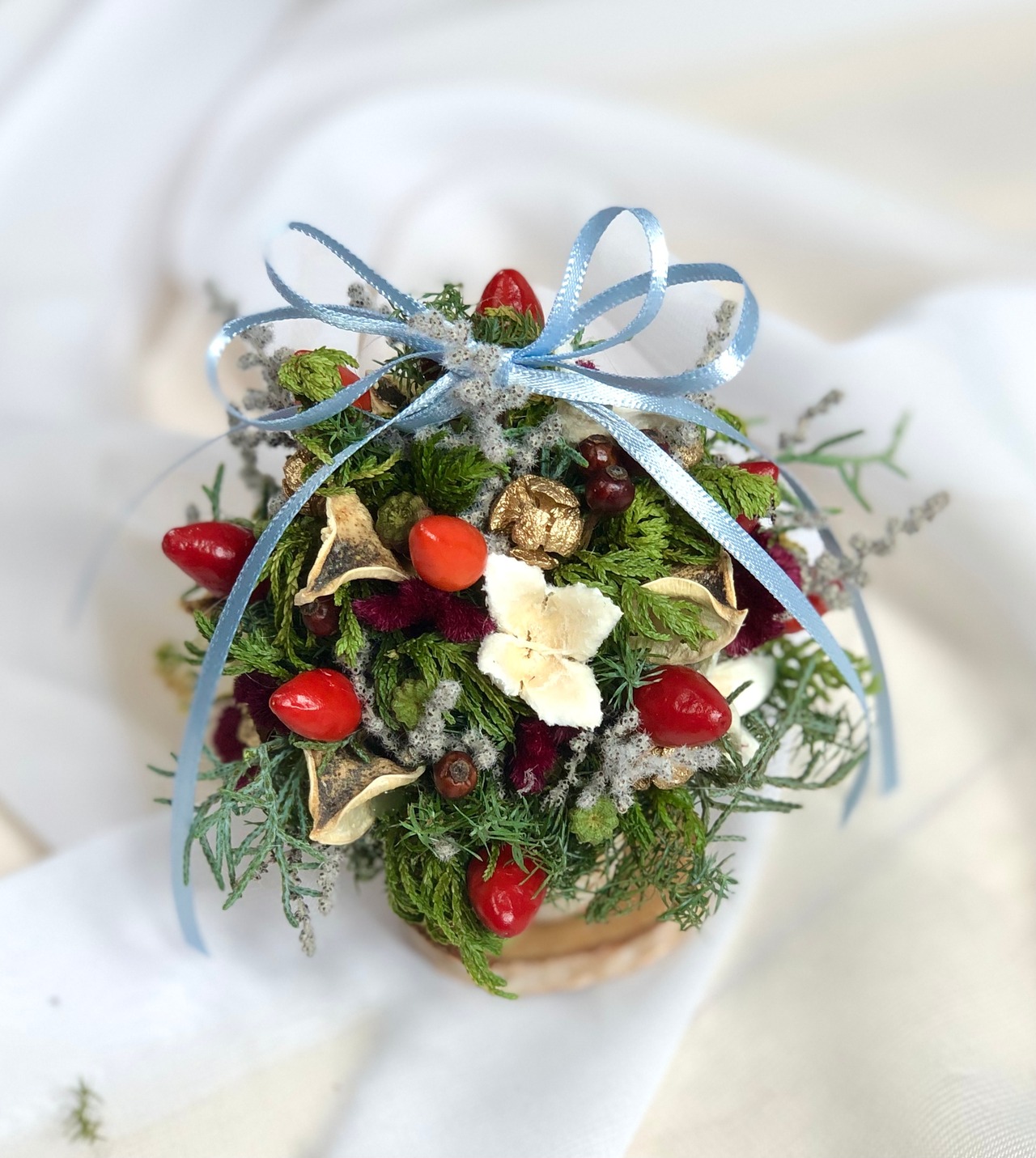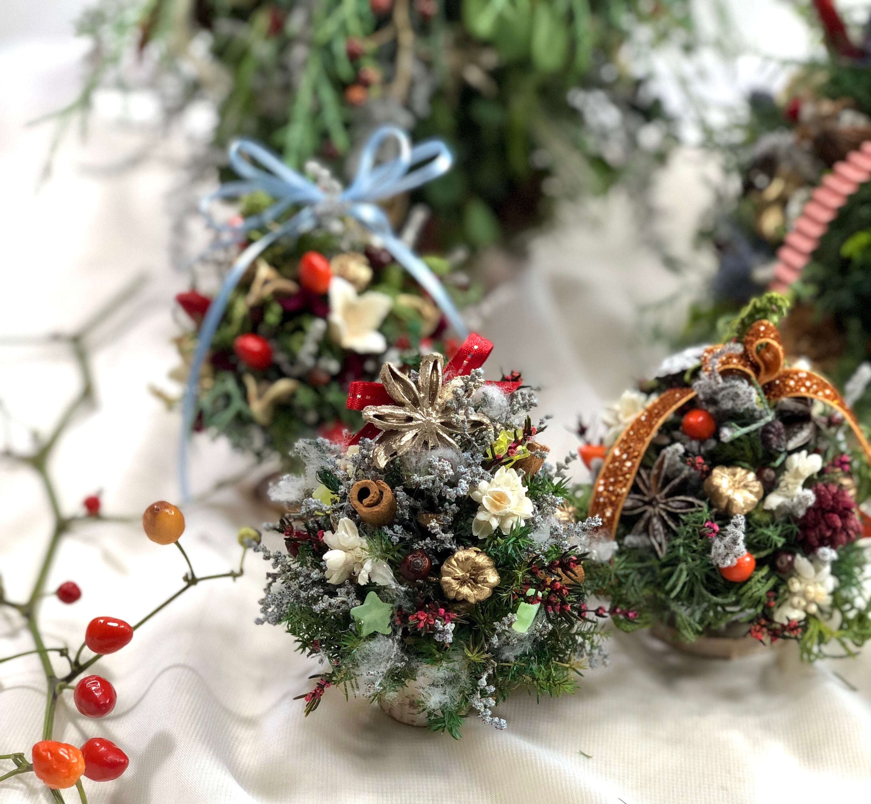 木の実などの飾りを付けて、ドライにしました。