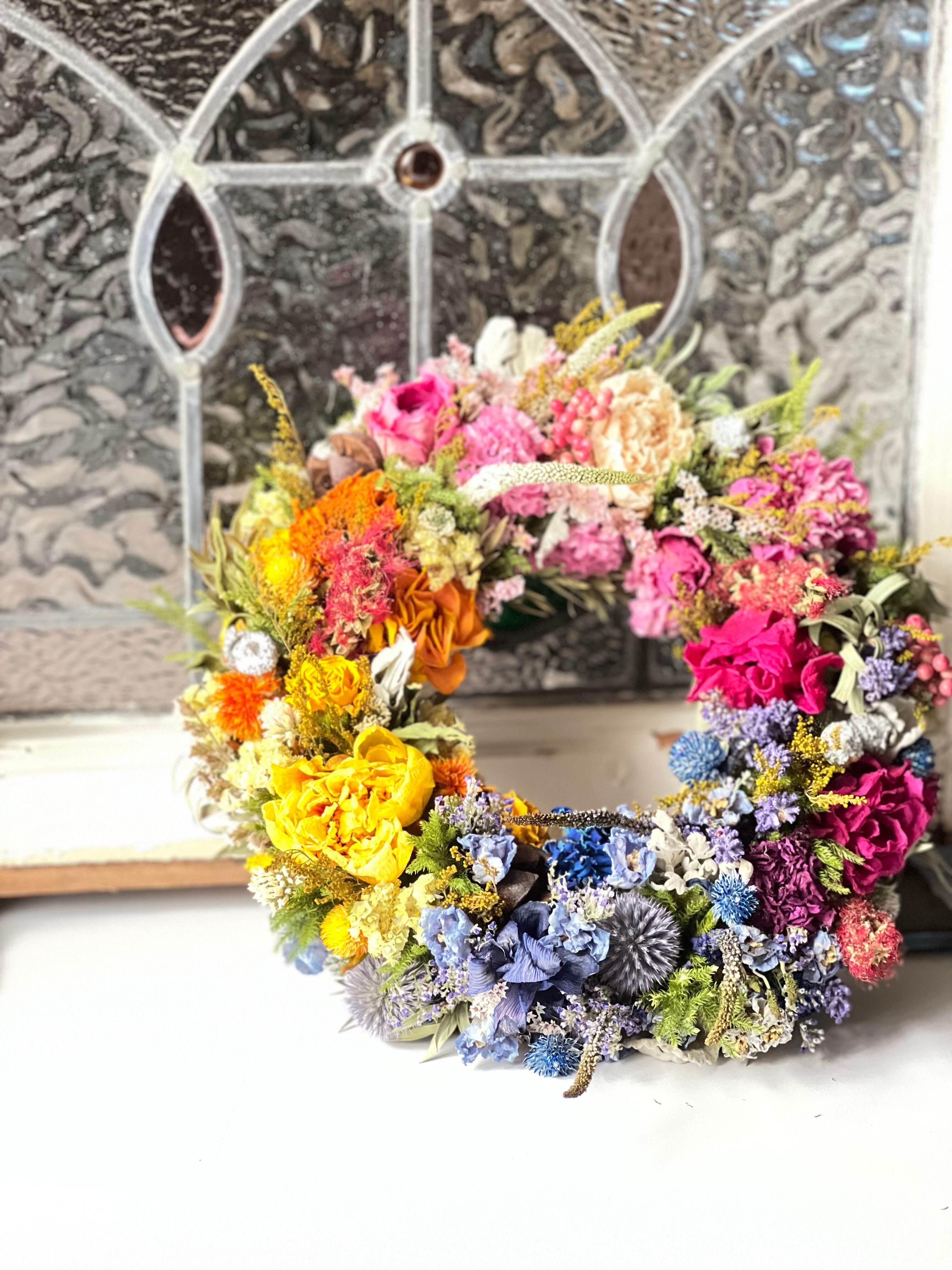 ドライフラワーのラウンドリースです。